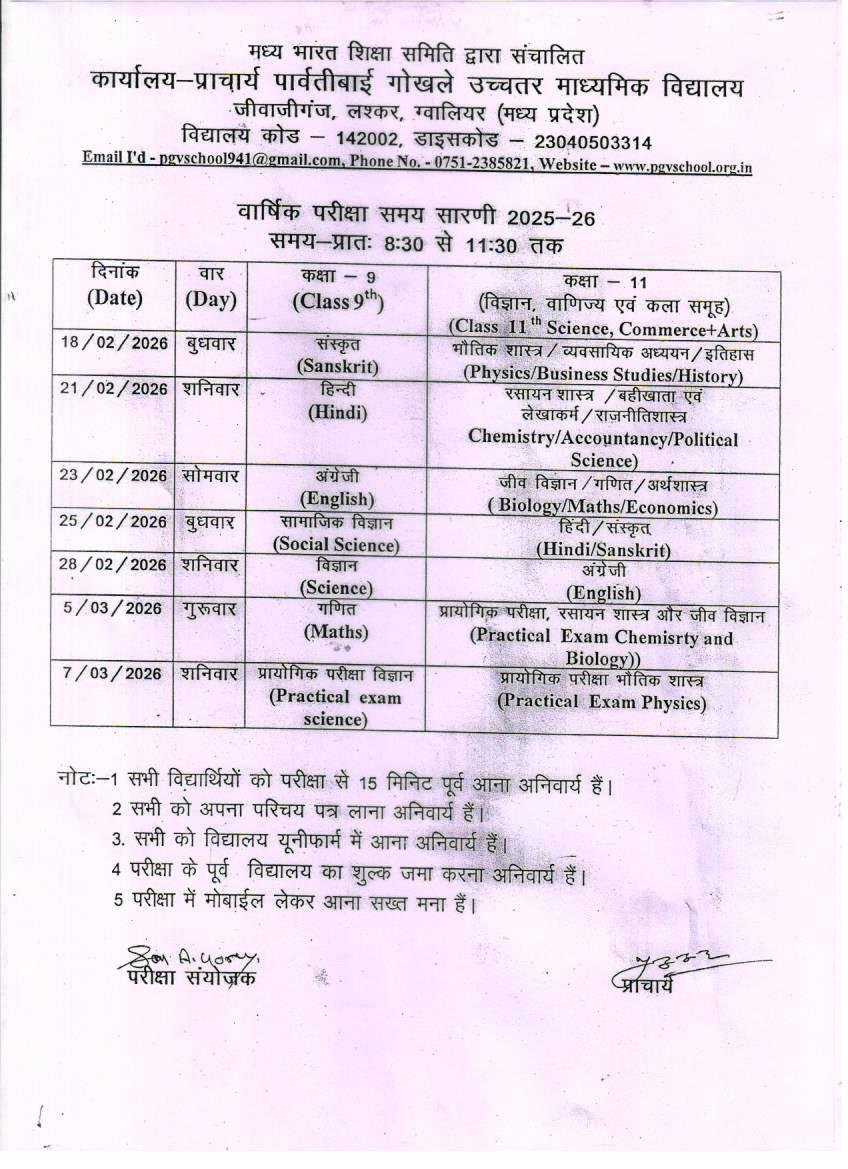 विद्यालय एक दृष्टि में परम श्रद्धेय स्वर्गीय श्री बाबा साहेब गोखले के असीम त्याग एवं परिश्रम के फलस्वरूप जुलाई सन् 1941 पार्वतीबाई गोखले विद्यालय नामक इस संस्था का जन्म हुआ। यह विद्यालय अपनी गरिमा एवं लोकप्रियता के कारण शीर्घ ही पी.जी.व्ही. इण्टर कॉलेज के नाम से विख्यात हुआ। कालान्तर में इसकी उत्तरेत्तर प्रगति होकर इस विद्यालय की चार शाखाएं पल्लवित हुई जिसमें पी.जी.व्ही. उ. मा. विद्यालय, लश्कर। 1 जुलाई सन् 1959 से प्रारंभ होकर वर्तमान में अपने वृहत् स्वरूप में बाबा गोखले मार्ग, जीवाजीगंज लश्कर, ग्वालियर (म.प्र.) में नगर के मध्य परंतु शहरी कोलाहल से दूर शांत एवं सुरम्य स्थान में स्थित है। इसके अतिरिक्त सार्वजनिक माध्यामिक विद्यालय, लश्कर है। अन्य चार स्नातकोत्तर महाविद्यालय- माधव कला एवं वाणिज्य महाविद्यालय, पा. गो. विज्ञान महाविद्यालय, माधव विधि महाविद्यालय तथा माधव शिक्षा महाविद्यालय के नाम से सफलतापूर्वक संचालित हो रहे हैं।